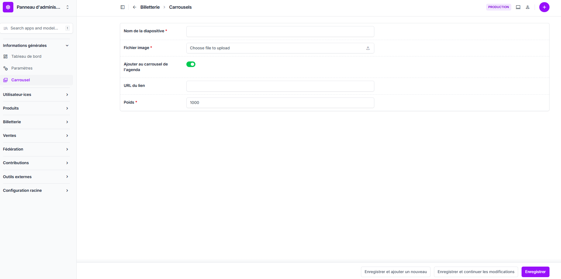 Remplissez le formulaire (Nom de la diapositive, image, URL du lien, poids, etc).