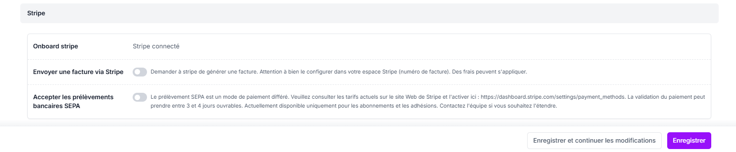 Dans cette section, vous pouvez vérifier ou activer les options liées à Stripe :
