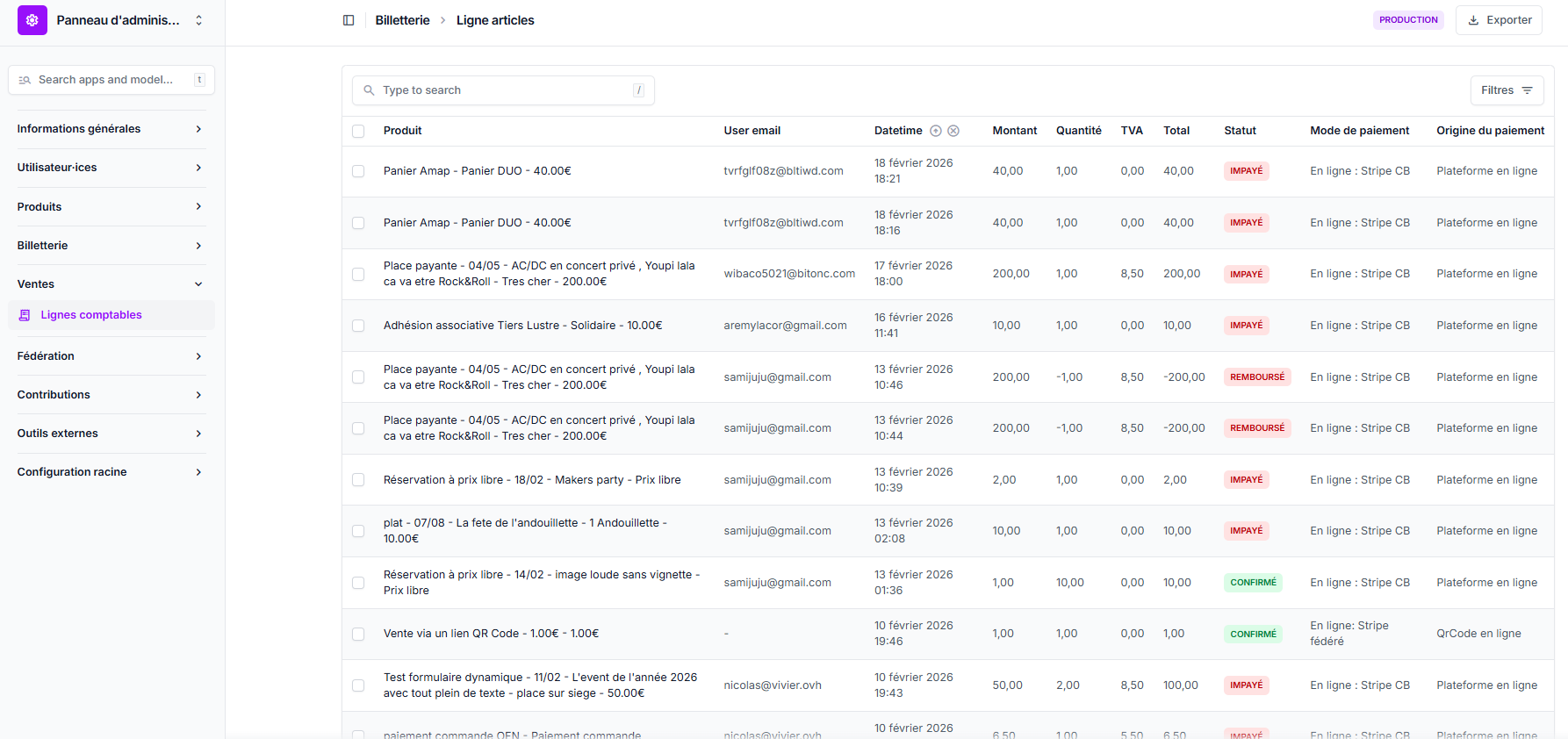 Allez dans l'onglet "Ventes", puis cliquez sur "Lignes comptables" dans le menu à gauche.