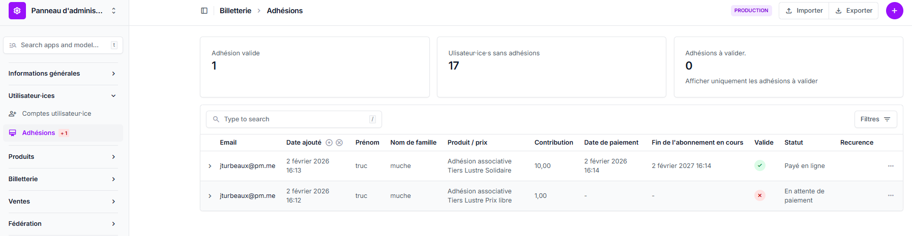 Allez dans l'onglet "Utilisateur-rices", puis dans "Adhésions" dans la colonne de gauche.