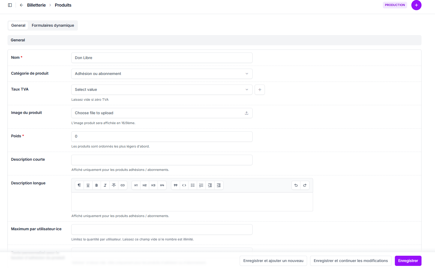 Vous pouvez créer une demande de don en suivant la même procédure que pour la création d’une adhésion ; seules la dénomination et la définition d’un prix libre diffèrent.