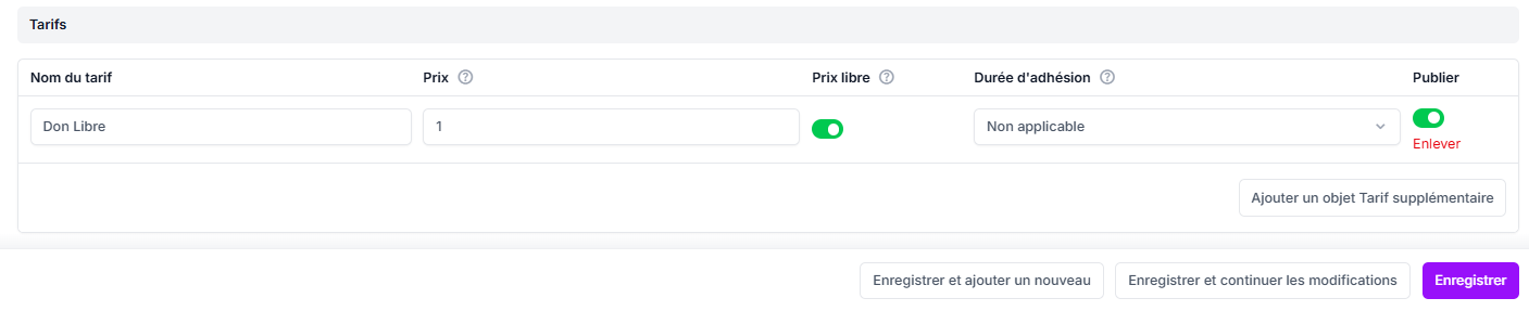 Cliquez sur Ajouter un objet Tarif supplémentaire.