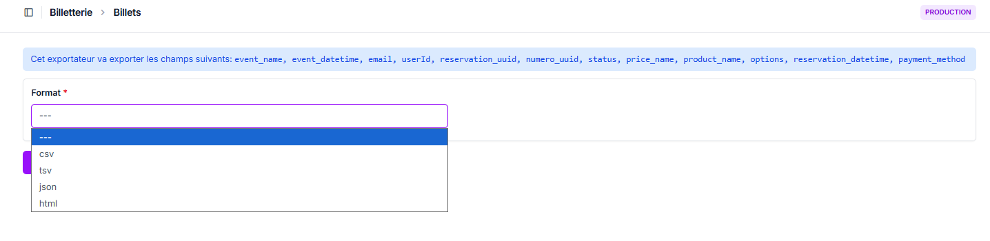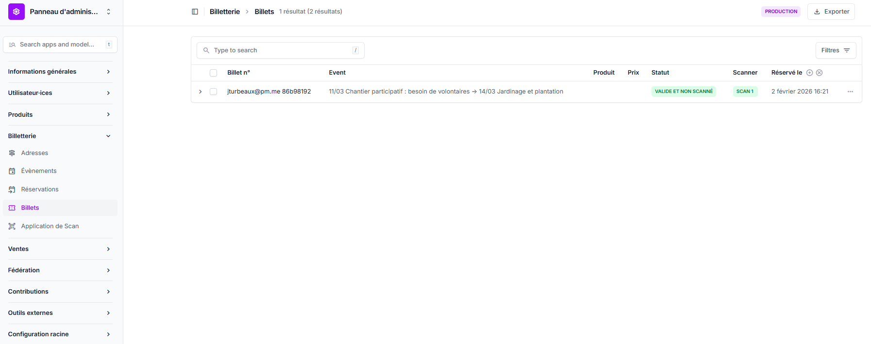 Pour exporter les billets de vos événements, rendez-vous dans le panneau d'administration.