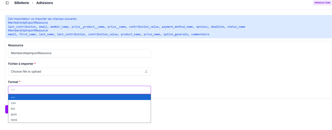 Sélectionnez le format d'importation (csv, tsv, json, html).