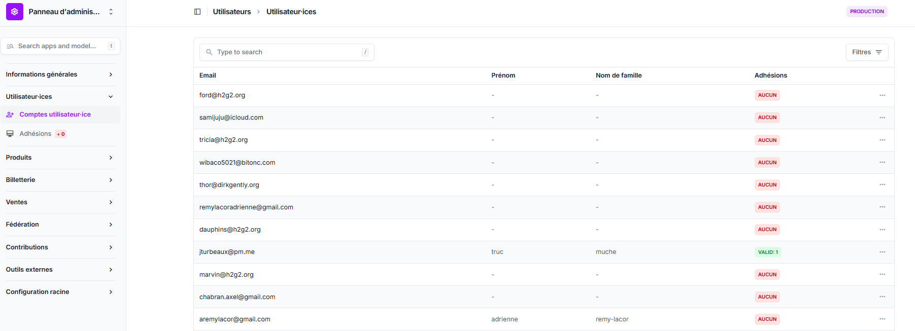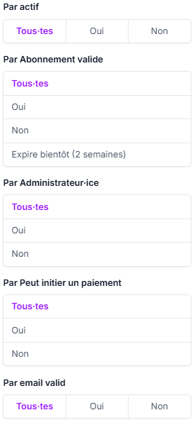 Afin de vous y retrouver plus facilement dans les différents comptes utilisateur-ice, vous avez à disposition un système de filtre avancé, ainsi qu'un système de recherche.