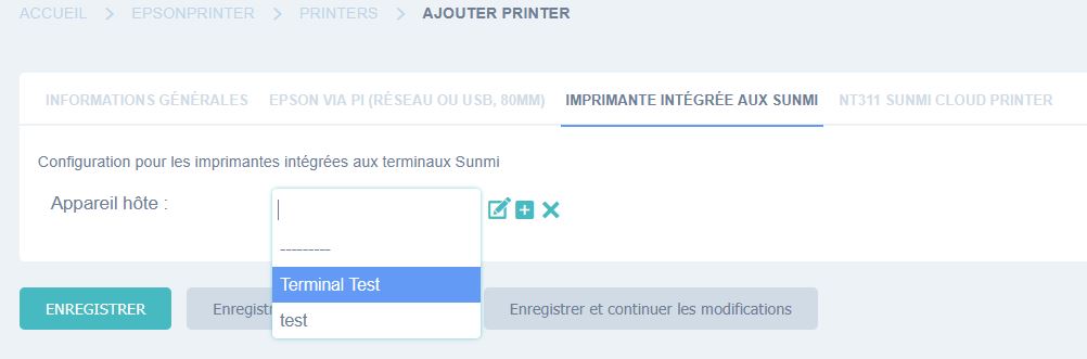 Si vous utilisez un Sunmi V2s, D3 mini ou un autre modèle avec imprimante intégrée, il suffit de sélectionner le bon hôte.