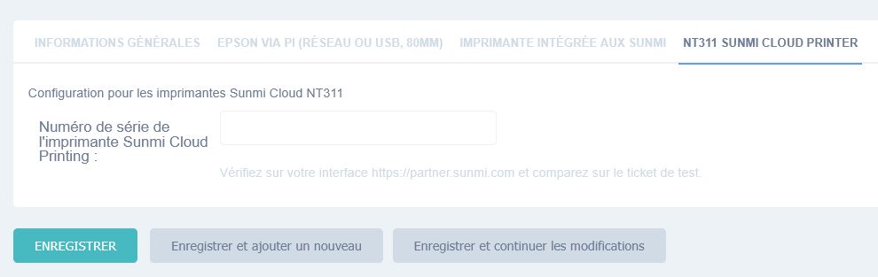 Si vous utilisez une imprimante Cloud Sunmi (souvent en cuisine ou au bar), vous devrez renseigner son numéro de série dans l'onglet "NT311 Sunmi Cloud Printer".