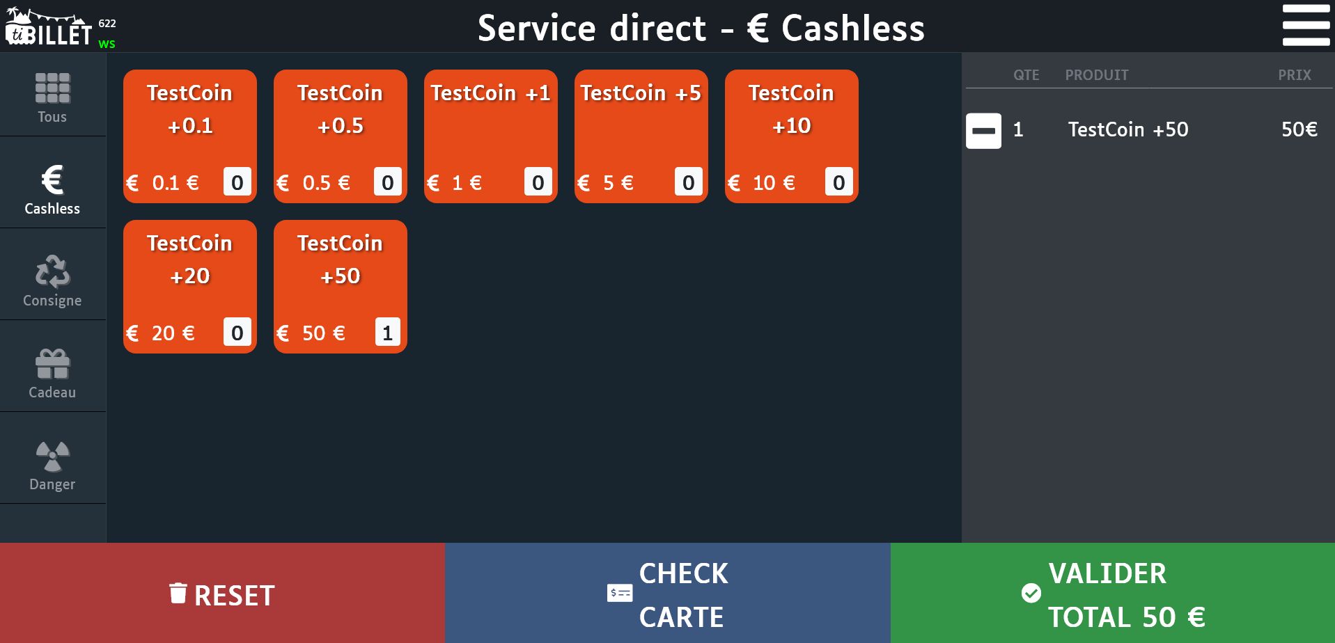 Vous choisissez le montant souhaité, par exemple 50 €, en appuyant sur l’article correspondant (ex : +50€). Le montant s’ajoute à la commande à droite de l’écran.