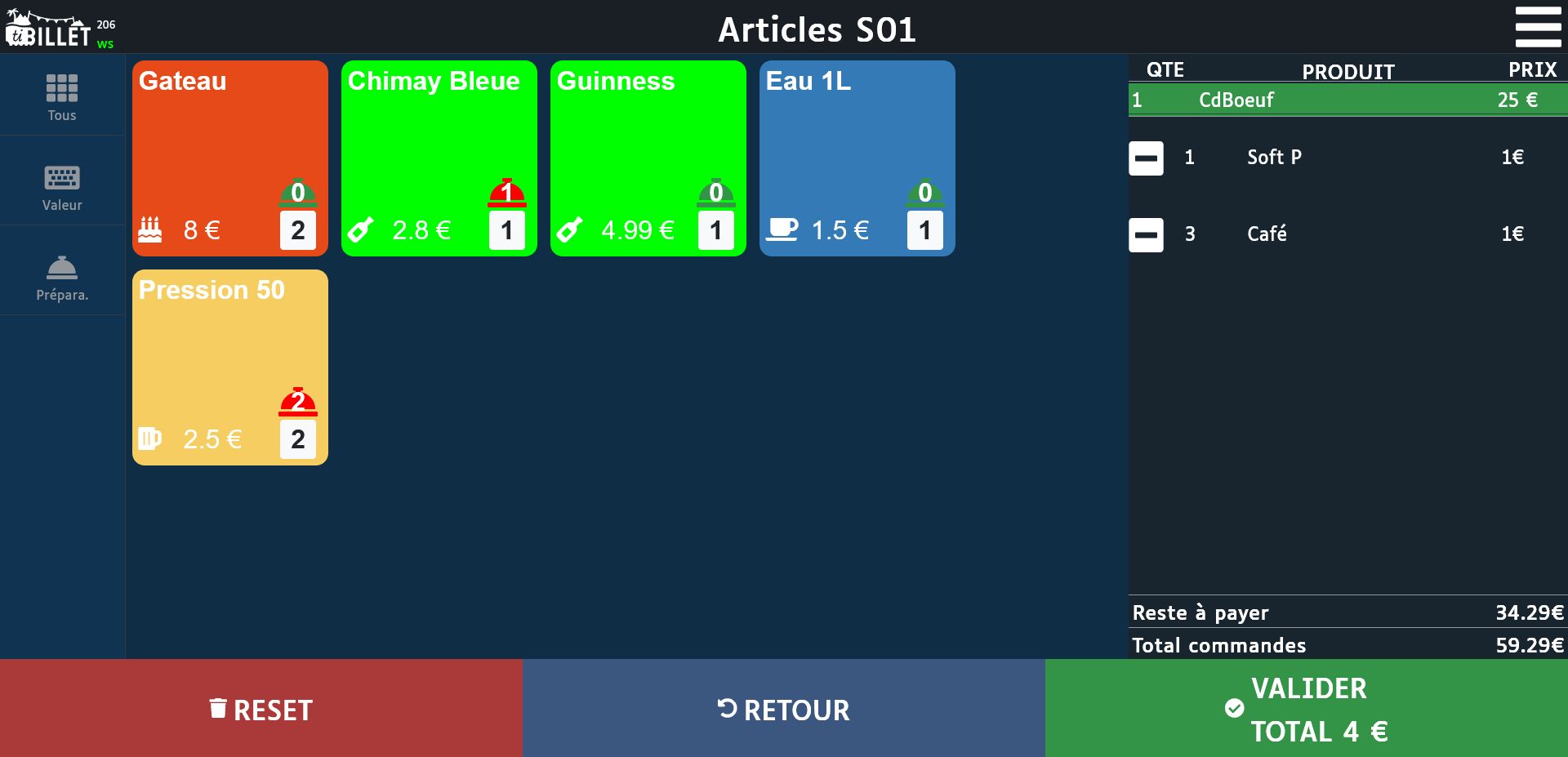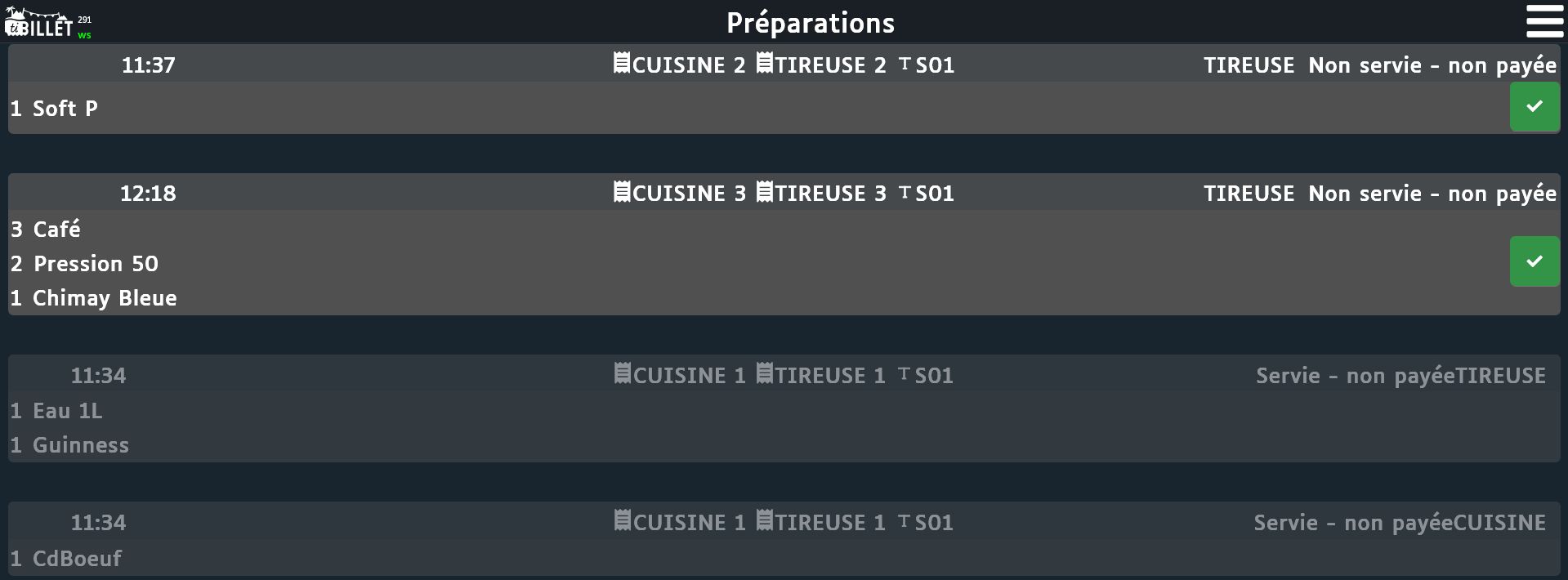 Ouvrez le menu Préparations (soit via le menu en haut à droite soit après avoir sélectionné une table)