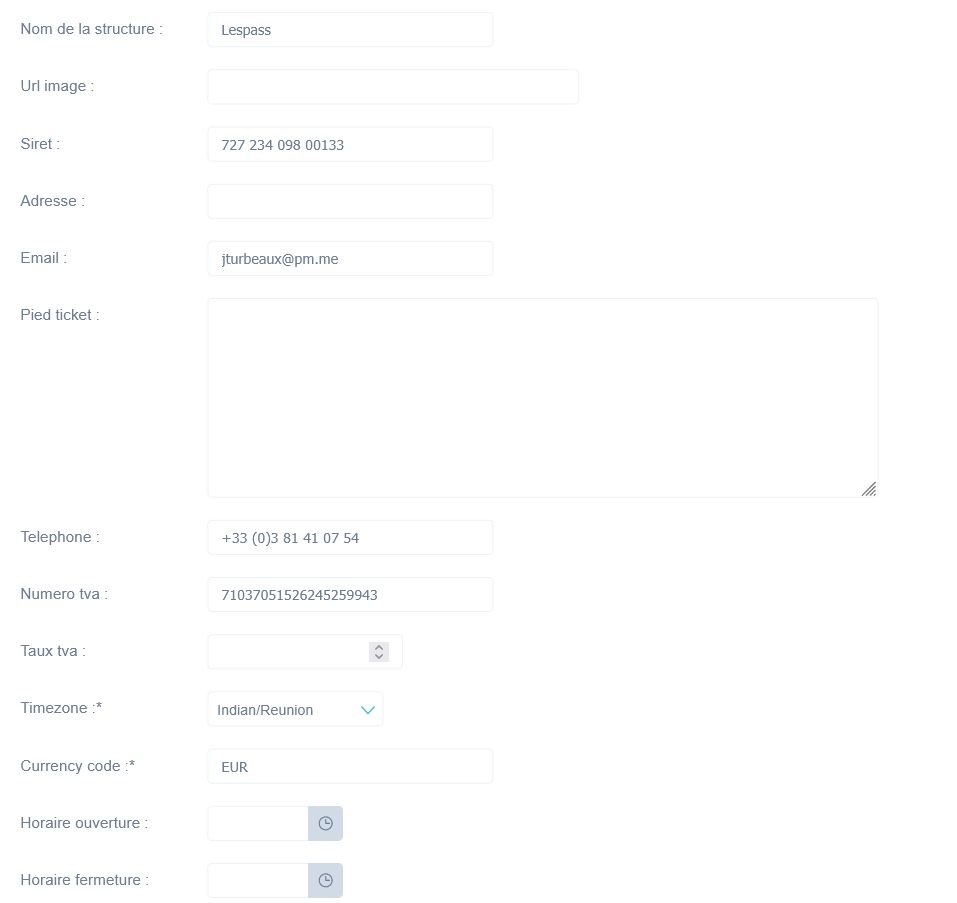 Nom de la structure, Logo ou image, SIRET, Adresse, Email de contact, Téléphone, Numéro de TVA et taux de TVA, Devise utilisée, Fuseau horaire, Horaires d’ouverture et de fermeture, Texte de pied de ticket.