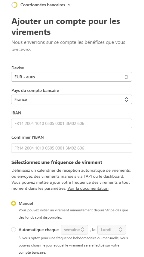 Une prévisualisation du numéro masqué peut apparaître une fois l’IBAN enregistré.