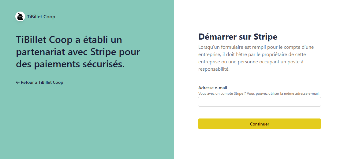Cette section affiche les premières informations demandées par Stripe concernant les structures professionnelles.
