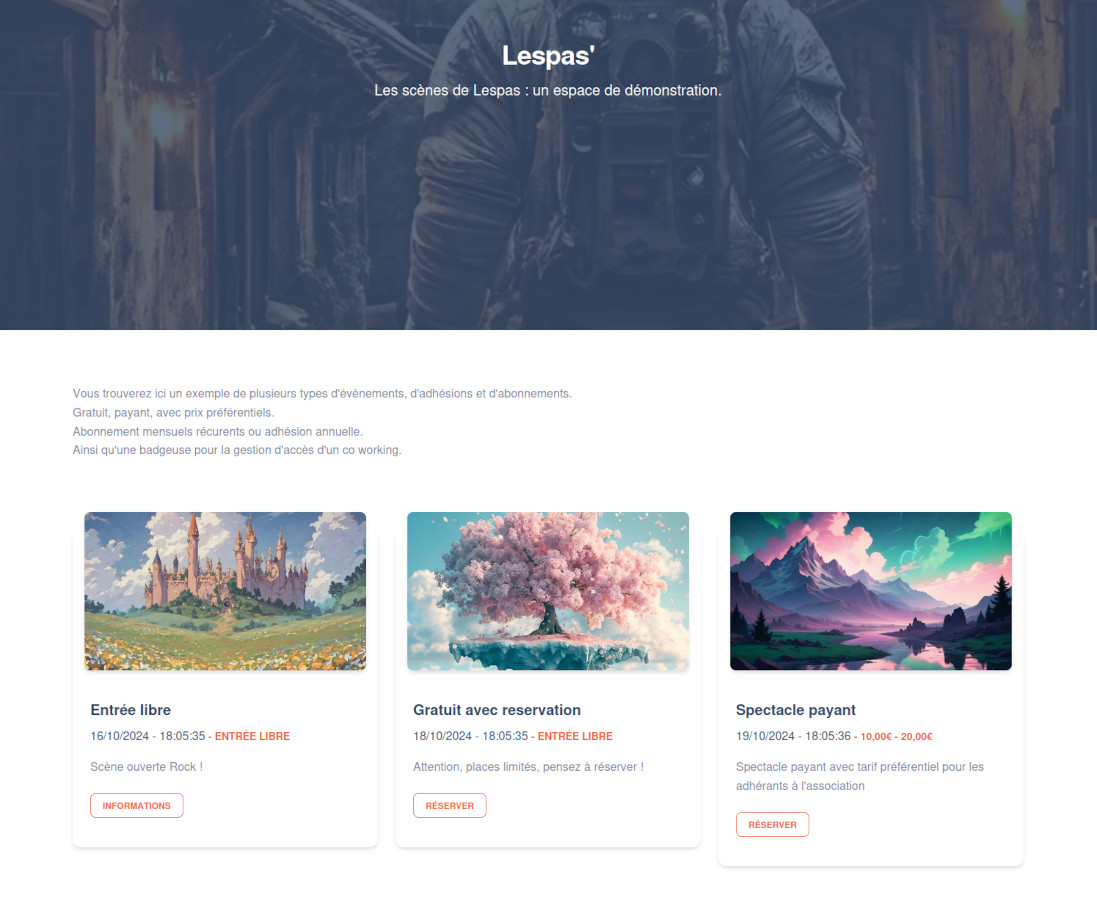 Paiement en ligne, renouvellement automatique, gestion de cotisation, gestion du portefeuille de monnaie temps. Abonnement commun à plusieurs lieux, fédération d'associations.